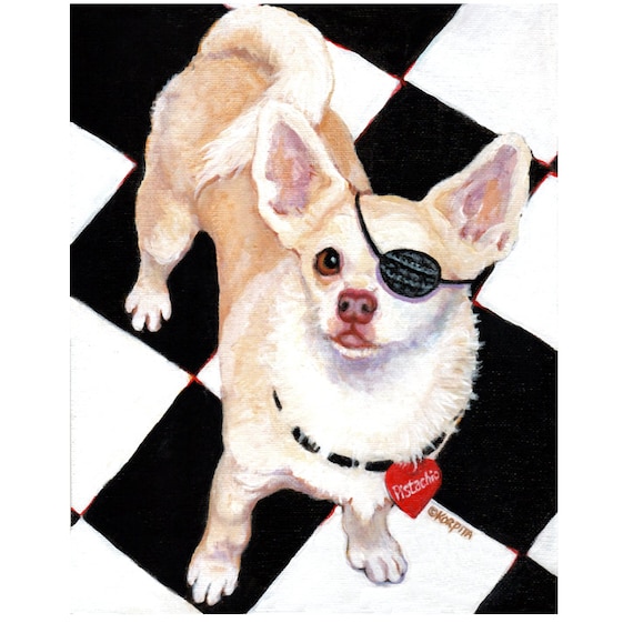 A PRINT of a White Chihuahua with Governor Eye Patch 8x10