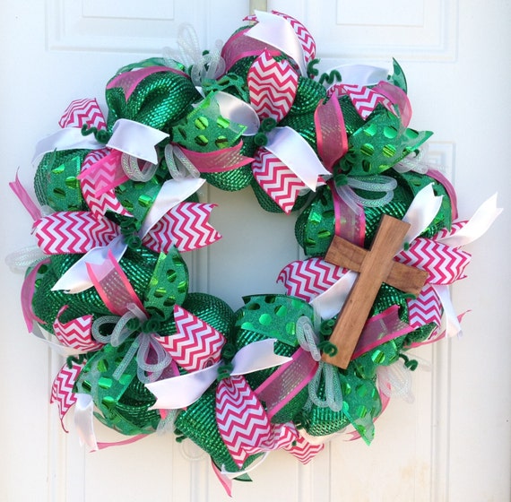 Pink and Green Wreath Cross Wreath Summer Deco Mesh Wreath